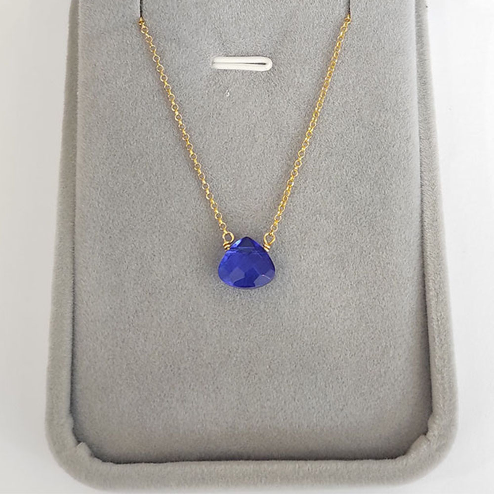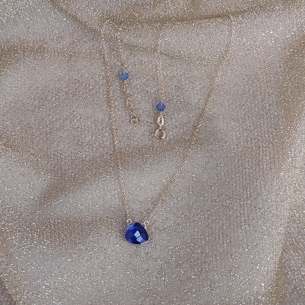 Ασημένιο επίχρυσο κολιέ με μπλε κρύσταλλο ακανόνιστου σχήματος και αλυσίδα extension για την αυξομείωση του μήκους. Οι ακροδέκτες είναι επίσης με μπλε στρογγυλούς κρυστάλλους. Διατίθεται σε άσπρο ασήμι και σε ασήμι rose gold στην ίδια τιμή.